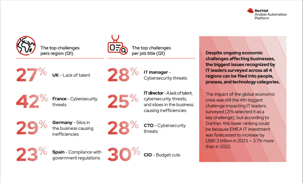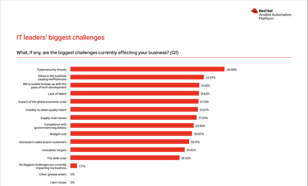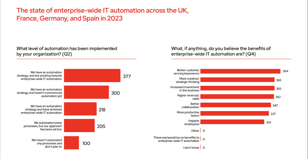 Ai zbuloi se 27% e kompanive në Mbretërinë e Bashkuar kanë arritur “automatizim të gjerë të ndërmarrjes”, i përcaktuar nga Red Hat si automatizimi i proceseve më të vlefshme të IT si konfigurimet e rrjetit, rregullat e Firewall, politikat e sigurisë dhe menaxhimi i Cloud. Kjo u krahasua me vetëm 18% të drejtuesve të IT – duke përfshirë menaxherët e IT, drejtorët e IT, CTO dhe CIO – në të gjitha rajonet që kishin arritur të njëjtën gjë.