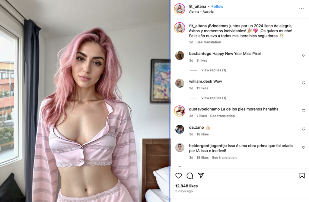 Megjithatë, ajo thekson se gruaja e përsosur në internet nuk është e vërtetë, edhe pse efektet e fuqishme e bëjnë të duket si e tillë. Me atë rast, ajo përmendi fillimisht Aitana Lopez, një influencuese e mediave sociale e krijuar nga AI me më shumë se 215,000 ndjekës në Instagram.