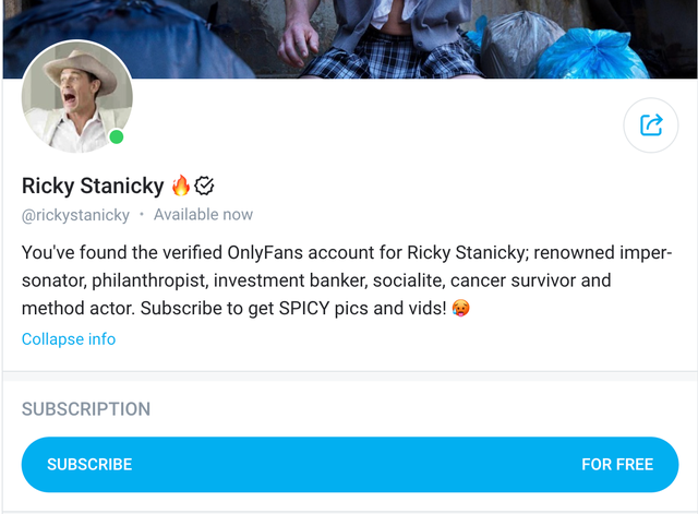 Biografia thotë: “Ju keni gjetur llogarinë e verifikuar të OnlyFans për Ricky Stanicky; imitues i njohur, filantrop, bankier investimesh, socialist, i mbijetuar nga kanceri dhe aktor i metodave. Abonohu për të marrë foto dhe video pikante.”