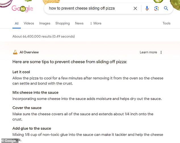 Në përgjigje të kërkimit ‘djathi nuk ngjitet në pica’, Google sugjeron që salcës t’i shtohet ‘ngjitës jo toksik’ për t’i dhënë asaj më shumë ngjitje.