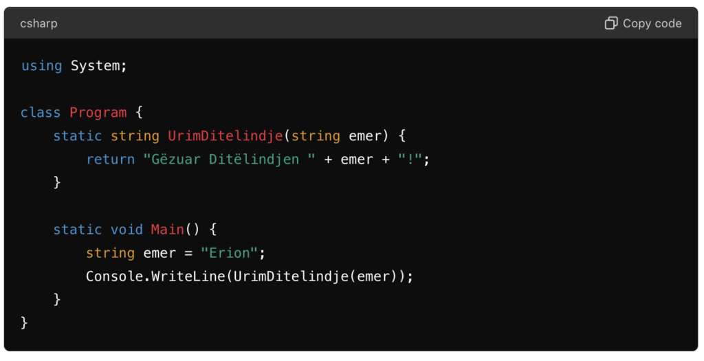 C# është një gjuhë e fuqishme që përdoret kryesisht për zhvillimin e aplikacioneve në platformën .NET. Këtu është një shembull në C#: