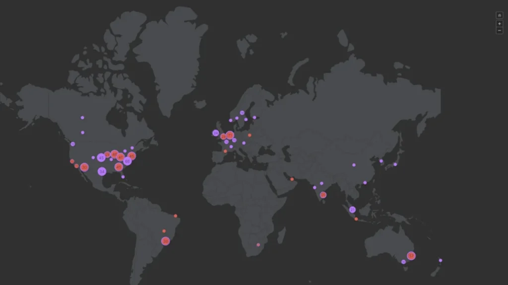 Sipas një harte të drejtpërdrejtë të siguruar nga kompania e monitorimit të internetit Thousand Eyes, aplikacionet dhe rrjetet kanë raportuar ndërprerje në të gjitha kontinentet, sipas Sky News. Harta tregon një numër veçanërisht të lartë ndërprerjesh të raportuara në Evropë, Shtetet e Bashkuara dhe Australi.