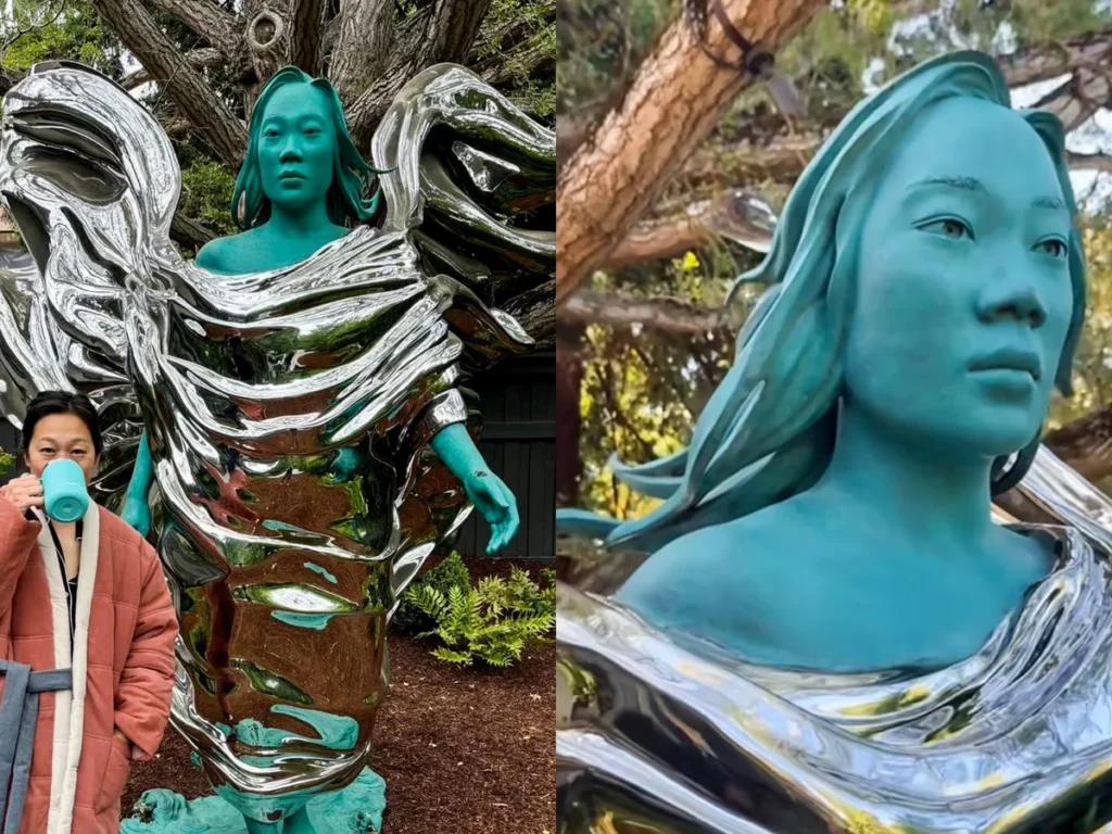 Chan, 39 vjeçe, veshi një mantel rozë pranë statujës masive bruz, e cila përmban një rrobë argjendi të fryrë nga era që në dukje i ngjan krahëve të engjëjve, teksa ajo gllënjka nga një turi që plotëson ngjyrën e pastruar, por të gjallë të skulpturës blu-jeshile.