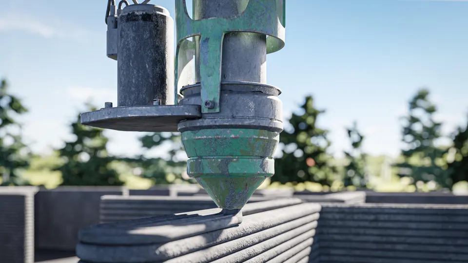 Pasi pluhuri i betonit, uji, rëra dhe përbërës të tjerë përzihen së bashku dhe derdhen në printer, një grykë e shtrydh përzierjen e betonit si pastë dhëmbësh në një furçë, duke ndërtuar shtresë pas shtrese përgjatë një rruge të para-programuar që krijon mure me efekt kadifeje.
