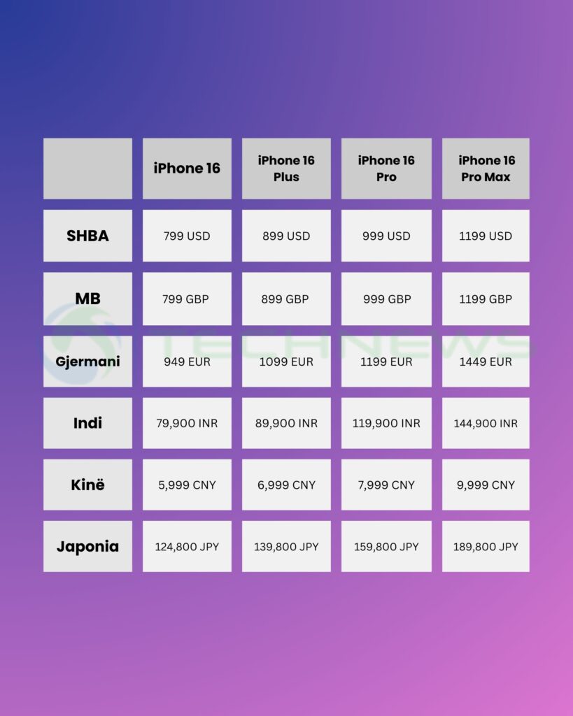 Seria e re e iPhone 16 është lançuar zyrtarisht më 9 shtator dhe çmimet e saj variojnë ndjeshëm në varësi të vendit ku blihet. Në Shtetet e Bashkuara, çmimi fillestar për modelin bazë të iPhone 16 është 799 dollarë, ndërsa në Europë, për shkak të taksave dhe tarifave doganore, çmimi mund të arrijë deri në 949 euro.