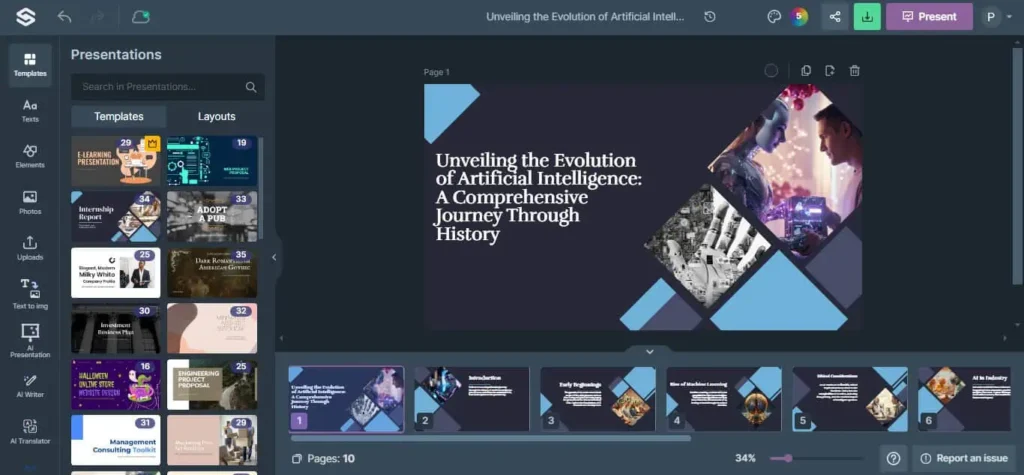 Kjo platformë ofron prezantime të mahnitshme me imazhe cilësore, përmbajtje të detajuar dhe grafika të dizajnuara mirë. Presentations.AI ka mbi 1,000 shabllone për biznese, edukim dhe marketing. Përveç kësaj, ju lejon të analizoni angazhimin e audiencës.