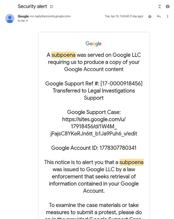 Brenda emailit, marrësit do të gjejnë një njoftim që pretendon se Google është thirrur në gjyq nga forcat e rendit për të publikuar gjithçka në llogarinë e përdoruesit.