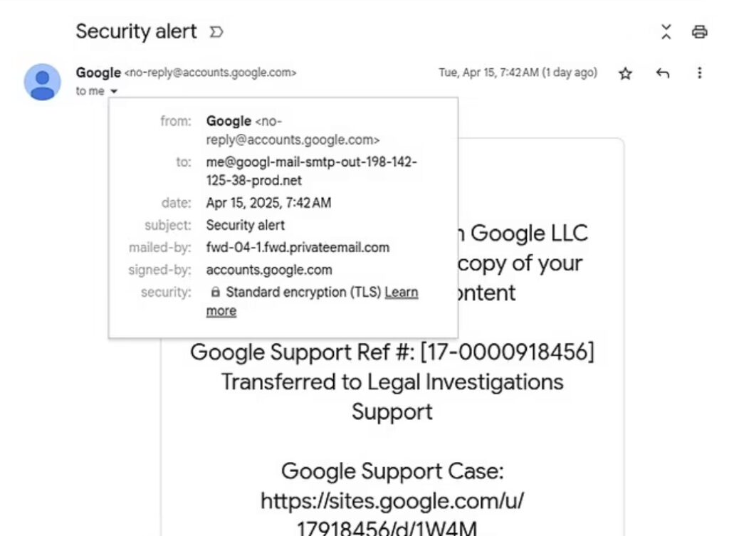 Ky aplikacion dërgon një email njoftimi që duket i vërtetë sepse vjen nga sistemi i Google, por në të vërtetë u përcillet viktimave përmes një shërbimi që fsheh mashtrimin.
