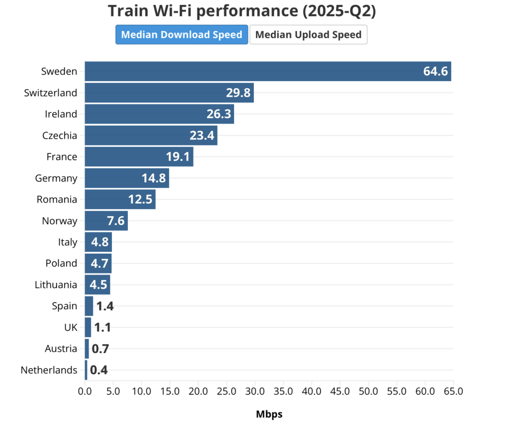 Suedia kryeson edhe për shpejtësinë e ngarkimit (upload), me një mesatare prej 55 Mbps, mbi dy herë më të lartë se Zvicra (25.6 Mbps). Kjo tregon se cilësia e rrjetit në trenat suedezë është në nivel shumë më të lartë krahasuar me pjesën tjetër të Evropës.