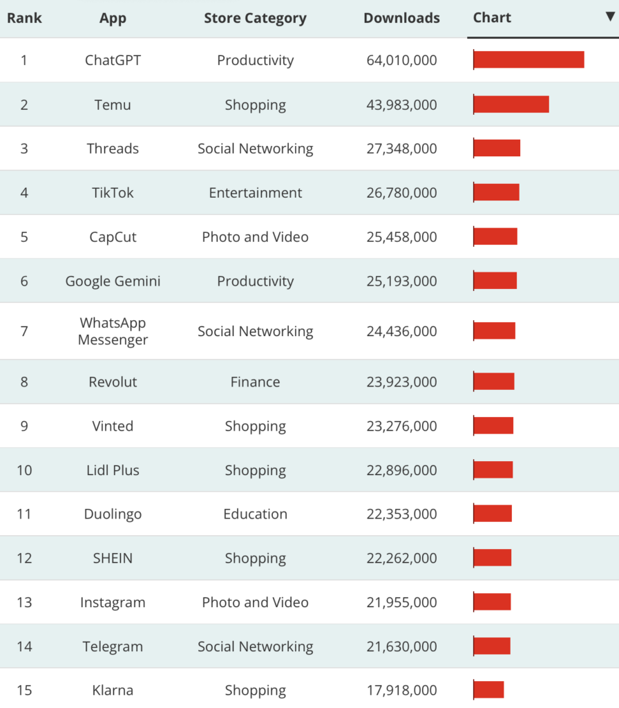 Aplikacioni më i shkarkuar në BE në vitin 2025 ishte ChatGPT, me pak mbi 64 milionë shkarkime. Është një lider i qartë, i ndjekur nga Temu me gati 44 milionë.