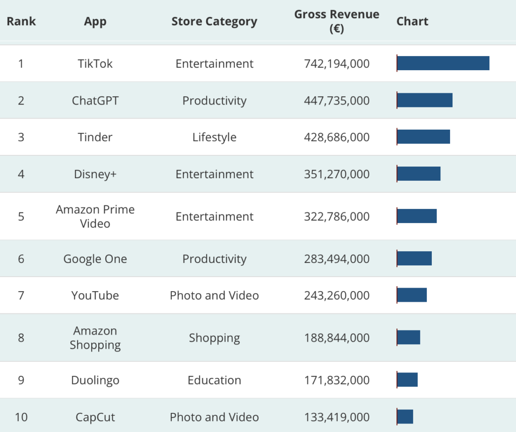 Aplikacionet e ndërtuara rreth abonimeve, veçorive premium dhe përmbajtjes dixhitale dominojnë fitimet. Platformat e transmetimit si Disney+ (351 milionë euro) dhe Amazon Prime Video (323 milionë euro), së bashku me shërbime si Google One (283 milionë euro) dhe YouTube (243 milionë euro), pasqyrojnë këtë model.
