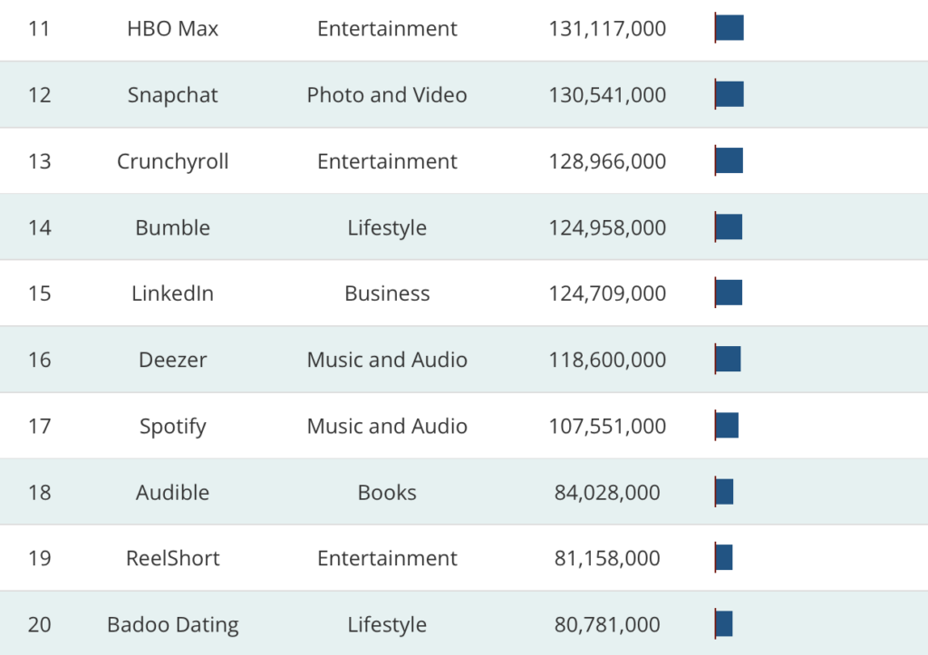 Nuk është vetëm Tinder. Lista e 20 të ardhurave kryesore përfshin gjithashtu Bumble (i 14-ti, 125 milionë euro) dhe Badoo Dating (i 20-ti, 81 milionë euro). Asnjë prej tyre nuk shfaqet në 20 vendet e para sipas shkarkimeve.