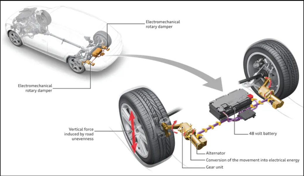 Ajo funksionon kështu, sipas një përkthimi të përafërt në anglisht të dokumenteve të patentës: normalisht, energjia nga pezullimi i një makine që lëviz lart e poshtë kur një rrotë godet një përplasje ose një kthesë në rrugë, në mënyrë efektive harxhohet si energji termike. Por konfigurimi i propozuar në patentë përfshin një gjenerator të vogël, volant dhe tufë në pezullimin që vepron për të kapur energji gjatë këtij procesi.